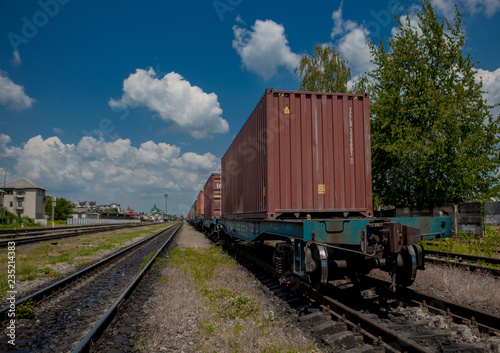 © volody10, Fototapeta premium Container loaded on train wagons on a railway