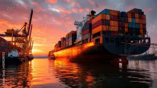 © Koplexs-Stock, Fototapeta premium Container ship at port during sunset with colorful sky reflecting on water.