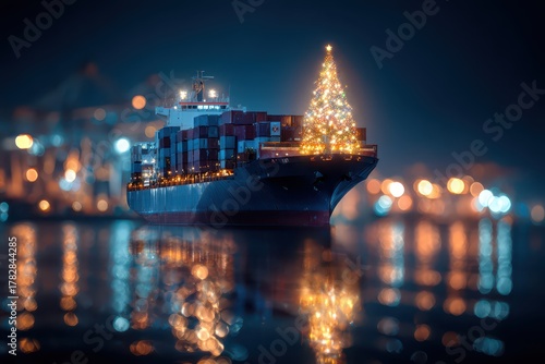 © Andrii, Fototapeta premium Container ship decorated for New Year celebration