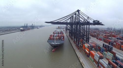 © Rere_Art151, Naklejka premium Container Ship Docked at Busy Cargo Port