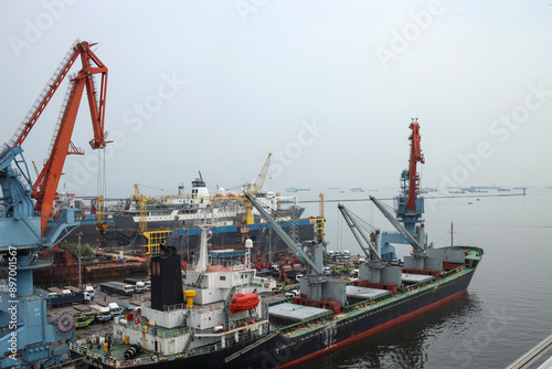 © Gatot, Fototapeta premium Container Ship Docked In The Port For Loading And Unloading Containers
