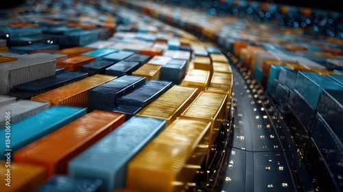 Obraz premium Container ship, glossy cargo modules arranged in curved patterns, 3D...