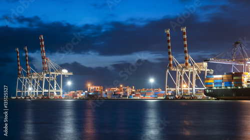 © arhendrix, Obraz premium Container ship in import, export port against twilight