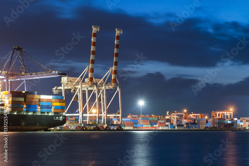 © arhendrix, Obraz premium Container ship in import, export port against twilight