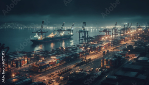 Fototapeta premium Container ship unloading heavy cargo at dusk generated by AI