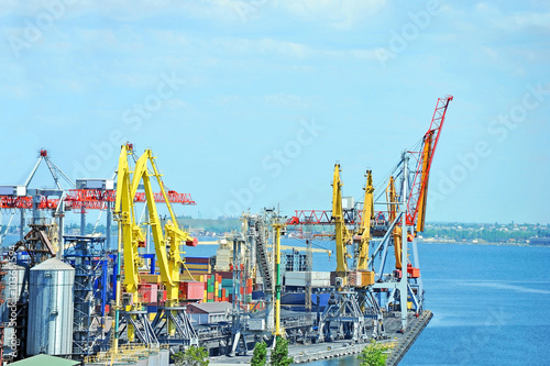 © Unkas Photo, Fototapeta premium Container stack and ship under crane bridge