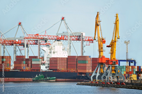 © Unkas Photo, Fototapeta premium Container stack and ship under crane bridge