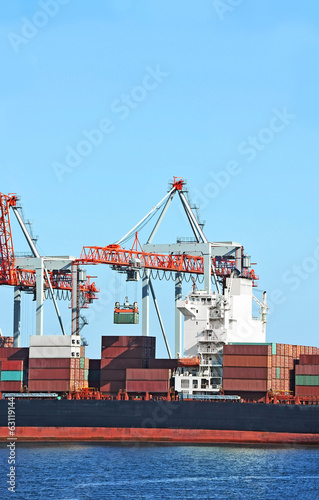 © Unkas Photo, Fototapeta premium Container stack and ship under crane bridge