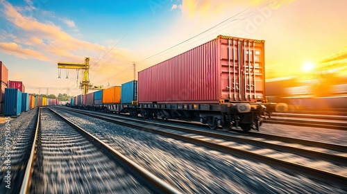 © BYAI, Fototapeta premium Container train moving along railway tracks at sunset in an industrial area with cranes in the background