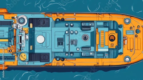 Fototapeta premium container vessel flat design top view ocean transportation theme cartoon drawing Complementary Color Scheme.