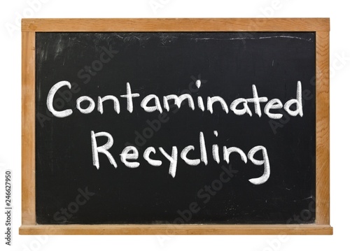 Obraz premium Contaminated recycling written in white chalk on a black chalkboard isolated...