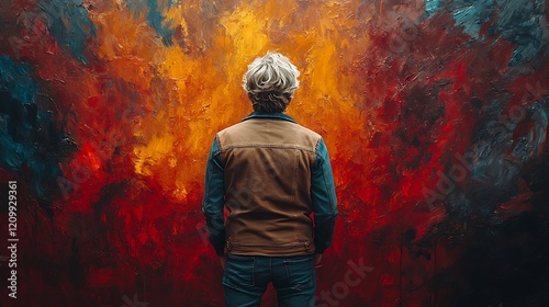 © ภูริพัฒน์ ภิรมย์กิจ, Obraz premium Contemplation Before Abstract Art: A person stands with their back to the viewer, gazing at a large, vibrant abstract painting dominated by fiery oranges, deep reds, and moody blues.