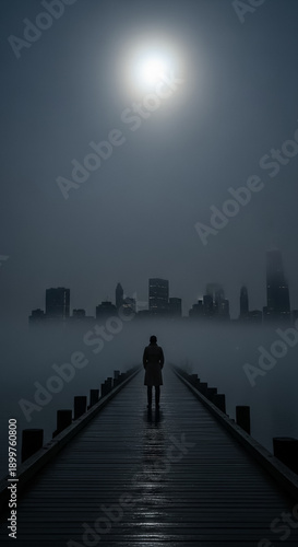 © Imaginarium_photos, Fototapeta premium Contemplation on a Misty Pier Towards an Urban Horizon