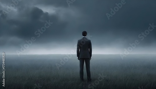 Obraz premium Contemplative businessman facing uncertainty open field digital artwork moody...