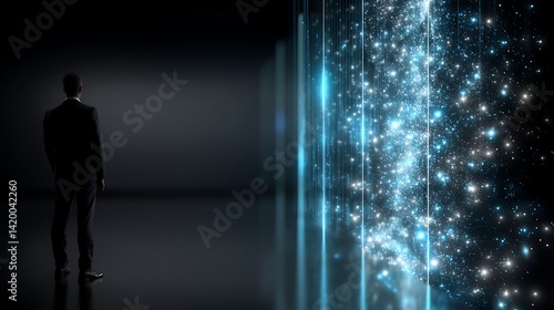 © Big9869, Fototapeta premium Contemplative Figure Gazing at Digital Starfield Revealing Future Potential and Technological Wonder.