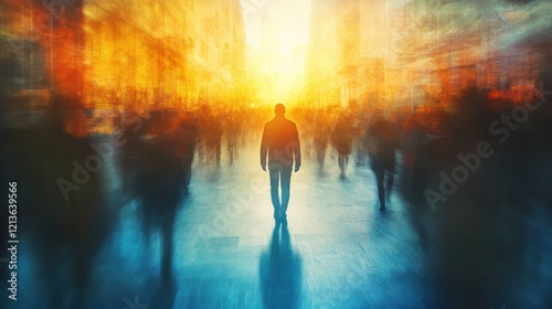 © nicole, Obraz premium Contemplative figure walking alone on a sunlit path amidst a blurred crowd, symbolizing individuality and purpose, conveying hope, focus, and connection in a journey of self-discovery.