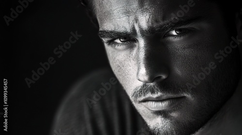 Fototapeta premium Contemplative Man in Black and White Portrait with Intense Expression