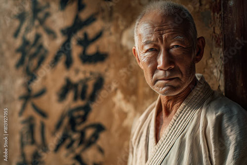 Naklejka premium Contemplative portrait of an elderly martial arts master in a worn traditional uniform by a calligraphy-covered wall, radiating strength and wisdom