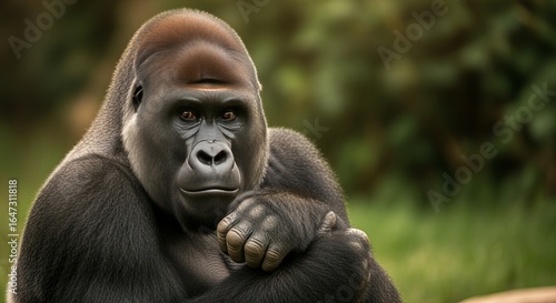 © kukuruyuk, Obraz premium Contemplative Silverback Gorilla Relaxing in Natural Green Habitat
