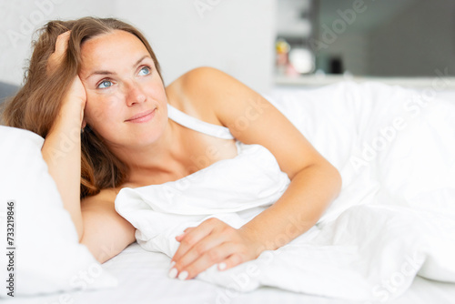 Fototapeta premium Contemplative Woman Relaxing in Bed