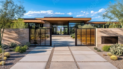 © Kultivad, Fototapeta premium Contemporary aluminum gates enhancing modern architecture of stylish home with landscaped surroundings and blue sky backdrop
