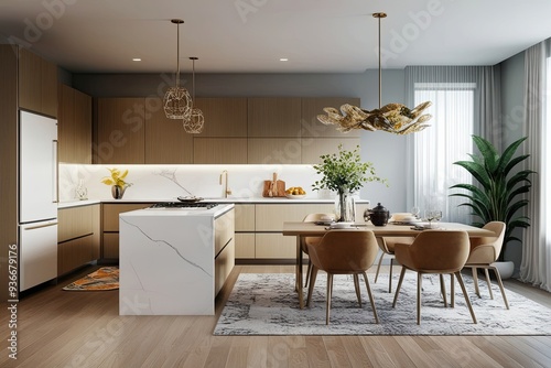 Fototapeta premium Contemporary Apartment Mock-Up Featuring Spacious Kitchen Design and Stylish...
