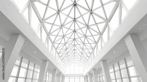 Fototapeta premium Contemporary atrium interior showcasing a complex geometric glass roof flooding the spacious architectural area with natural daylight supported by clean white columns and structural beams