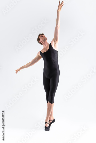 © danmorgan12, Fototapeta premium Contemporary Ballet Dancer Flexible Athletic Man Posing in Black Tights in Ballanced Dance Pose With Hands Lifted