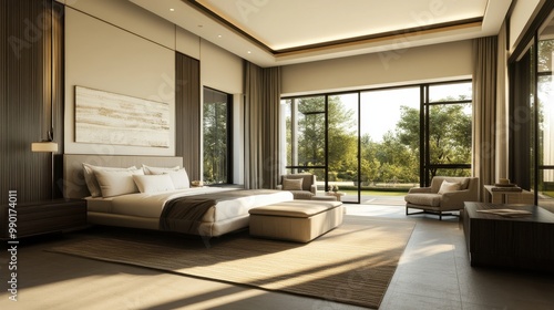 Naklejka premium Contemporary bedroom with large windows overlooking a serene garden in midday...