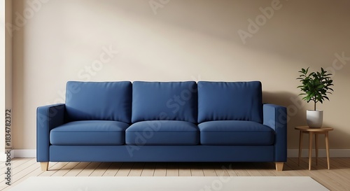 Fototapeta premium Contemporary blue sofa with plant creates a calming interior design