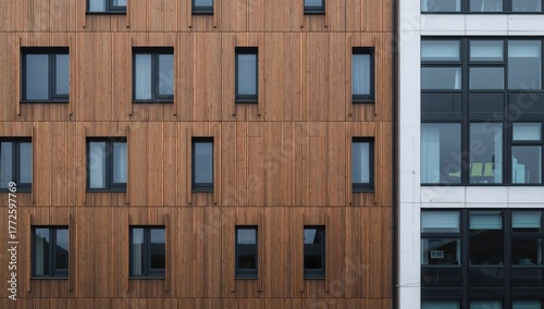 Naklejka premium Contemporary Building Exterior Featuring Wood Panels and Glass Windows, Urban Density