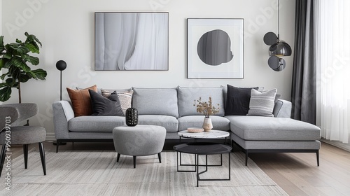 Obraz premium Contemporary Chic: Scandinavian Home Interior with Gray Sofa, Marble Stool,...