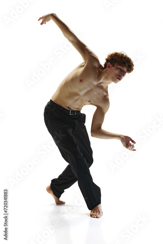 © Lustre Art Group , Obraz premium Contemporary dance performances. Male dancer in black pants, bending toward in dance pose against white studio background. Concept of human motions, wellness, natural beauty of male body.