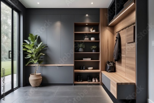© Nirwasita, Fototapeta premium Contemporary Dark Grey And Wood Foyer Design With Stepped Storage Unit