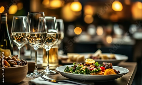 © Valentyna, Naklejka premium Contemporary dining room featuring a marble table, beige chairs, and pendant lights in warm tones creating an inviting ambiance.