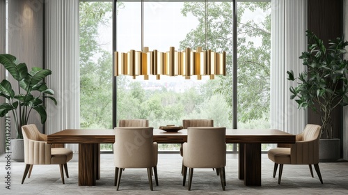 © M.Gierczyk, Obraz premium Contemporary dining room with elegant wood table and soft beige chairs