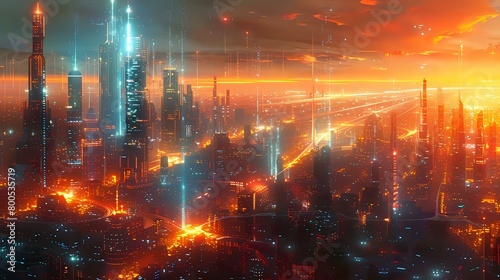 Obraz premium Contemporary Edge: Futuristic Cityscape with Illuminated Grid-like Roadways