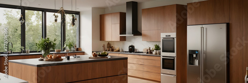© Younes, Fototapeta premium Contemporary Elegance: Streamlined Interiors, Chic Furnishings, and Soft Hues in an Airy Living Environment with Seamless Kitchen Integration and Abundant Natural Illumination