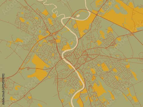© W&S Stock, Obraz premium Contemporary flat map of Dumfries, United Kingdom design with muted sage base, rust-colored roads, and soft ochre highlights.
