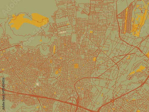 © W&S Stock, Fototapeta premium Contemporary flat map of GRE, Acharnes design with sage/olive tone field with rust networks and ochre shapes, cream water.