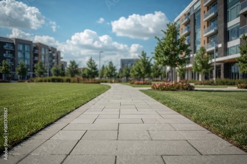 © AkuAku, Fototapeta premium Contemporary geometric stone tiles laid along a fresh walking trail in a leisure area.