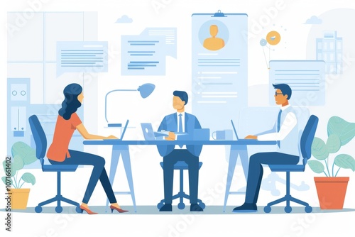 Fototapeta premium Contemporary graphic of HR professionals conducting interviews, bright and modern design