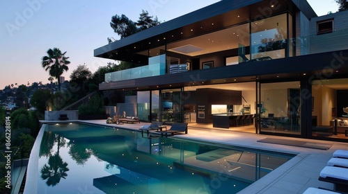 Obraz premium Contemporary home with sleek design, glass walls, and a beautiful pool area