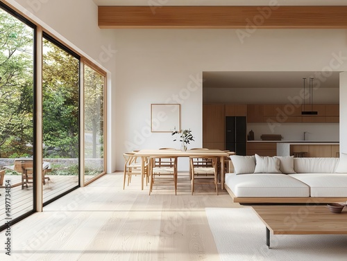 Fototapeta premium Contemporary Japanese villa interior with open mezzanine, seamless indooroutdoor connection, and wabisabi aesthetics