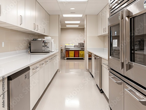 Fototapeta premium Contemporary kitchen design stainless steel appliances in a minimalist commercial space - wide angle perspective