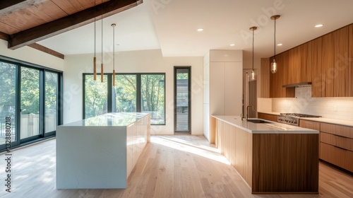 Fototapeta premium Contemporary kitchen interior with natural light, wooden accents, minimalist design, and spacious layout in stylish modern home setting