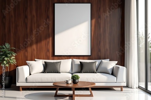 Fototapeta premium Contemporary Living Room Interior: White Sofa, Dark Wood Paneling, Blank Art Frame, Round Coffee Table, Potted Plant, Natural Light by Window, Minimalist Design