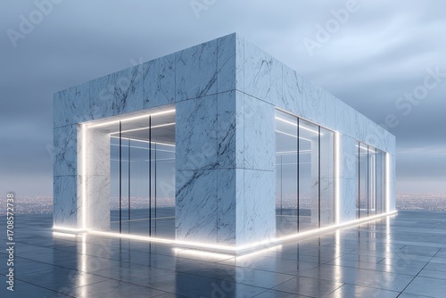 © whitestorm, Fototapeta premium Contemporary marble and glass building with glowing lights, city views.