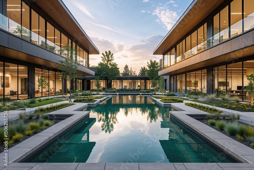 Obraz premium Contemporary Office Spaces Featuring Innovative Architecture Outdoor Courtyards and Serene Lakes