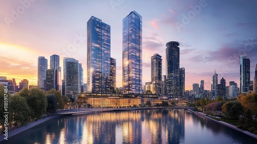 © Naveed Arts, Naklejka premium Contemporary office towers with sleek glass facades, capturing the modern and dynamic architecture of cityscapes with high-rise buildings and reflective surfaces.